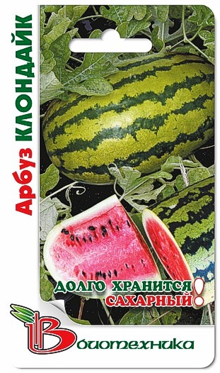 Семена арбуза "Клондайк" (Clondajk) – это высокоурожайный оригинальный сорт отличающийся среднеранними сроками созревания. Между появлениями всходов и началом сбора урожай проходит 90-95 дней. Растение мощное, с длинными плетями. Плоды продолговатой, овально-удлиненной формы, светло-зеленого цвета с темно-зелеными продольными полосками. Средний вес достигает 12-13 кг. Мякоть плотная, темно-красного цвета, с высоким содержанием сахара. Кожура тонкая, но очень прочная. Сорт обладает высокими товарными качествами и отличной транспортабельностью.