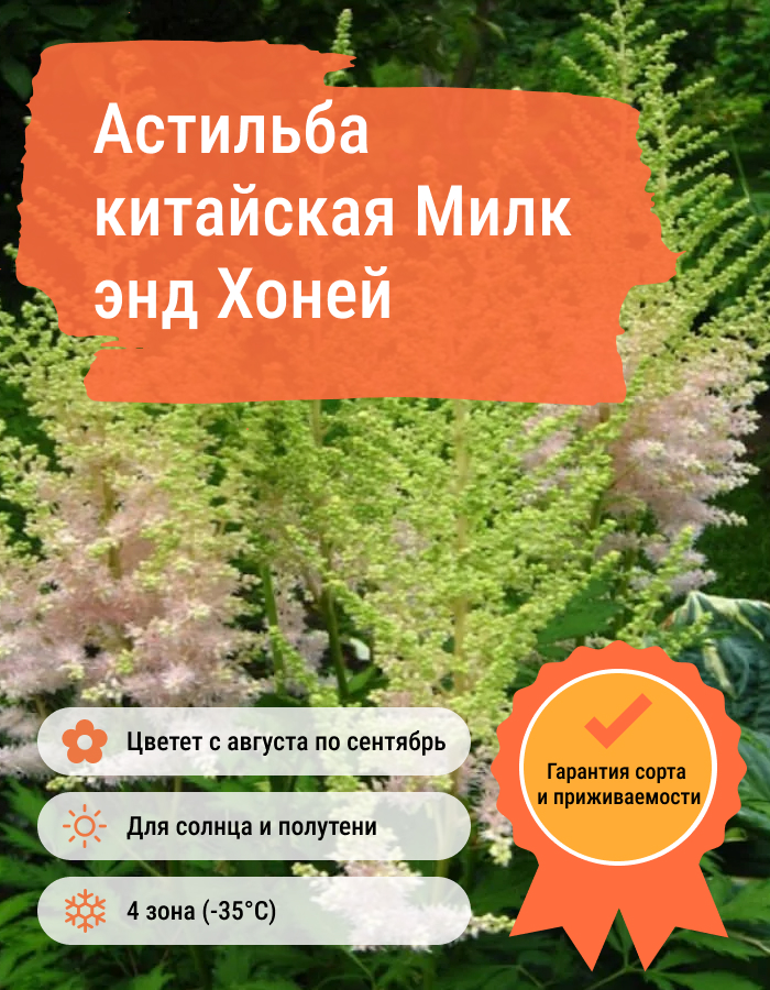 Рассада астильбы «Мед и молоко» (Milk and Нonney) вырастает в невысокое растение высотой около полуметра. Растение имеет густую листву темно-зеленого цвета. Цветение рассады астильбы «Мед и молоко» начинается в июле и длится на протяжении месяца. Цветочки, которые раскрываются в этот период, имеют нежный сливочно-белый цвет и приятным розовым оттенком. Сорт морозоустойчив. Садоводы любят использовать этот цветок для групповых и одиночных посадок, а также для срезки. Семена астильбы «Мед и молоко» лучше на солнечные участки, в полутень или тень в питательную почву. Полив умеренный.