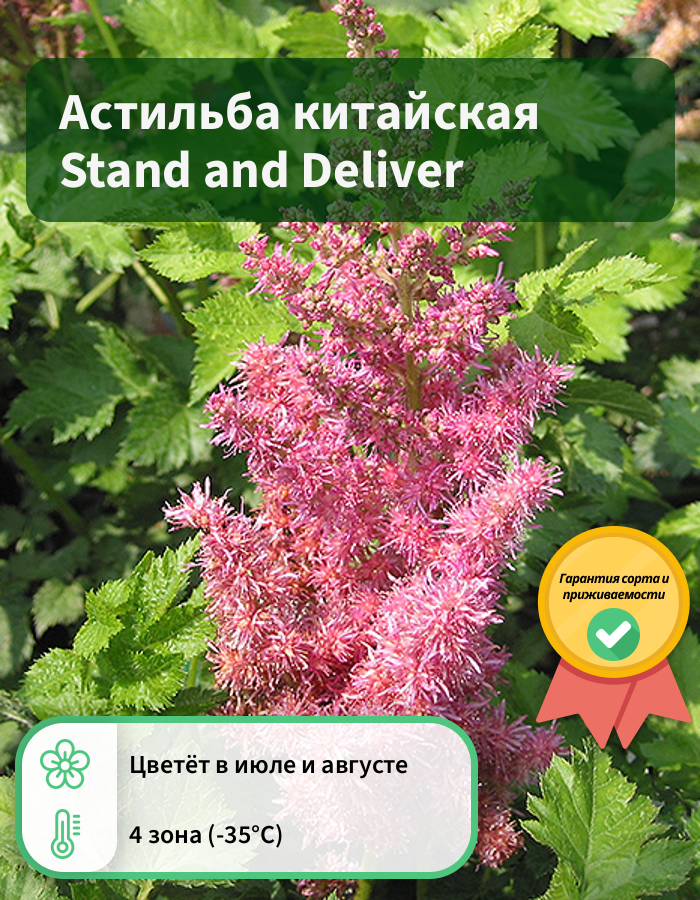 Саженцы Астильбы китайской Стэнд энд Деливер (Stand and Deliver) расцветают во второй половине лета роскошными пурпурно-розовыми соцветиями - метелками. Растение привлекает своей нетребовательностью к уходу, морозостойкостью (до минус 34 градусов) и иммунитетом к недугам. Многолетник хорошо растет на глинистой почве, ему не страшно небольшое переувлажнение, а вот засухи он не выносит.
