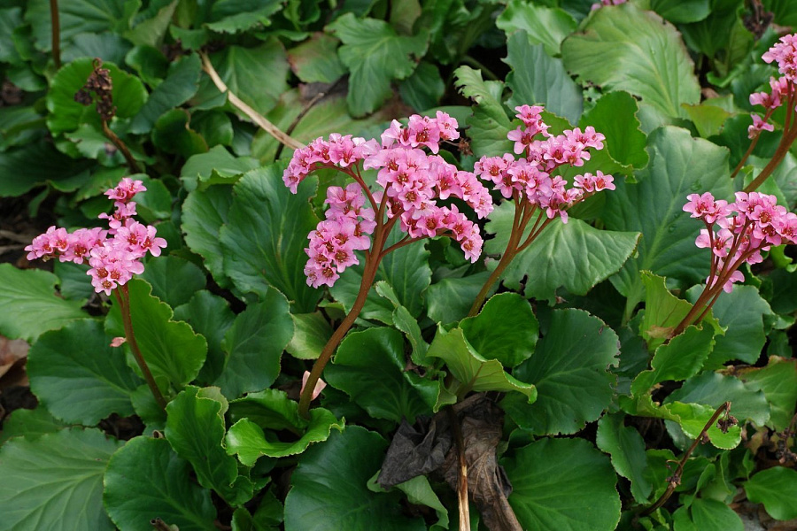 Бадан Сердцелистный (BERGENIA cordifolia) – неприхотливое растение с мощной зеленой листвой и красивыми нежно-розовыми цветами. Отлично переносит влагу и затенение, хорошо себя чувствует в низинах, растет в тени деревьев и кустарников. BERGENIA cordifolia хорошо смотрится в групповых посадках, в альпинариях, на рабатках. Цветение начинается в мае и продолжается до конца июня. Соцветия высокие, до 40 сантиметров, пышные. Мощная ярко-зеленая листва обеспечит декоративность растения на протяжении всего лета, в осенний период она приобретает красно-коричневый окрас.
