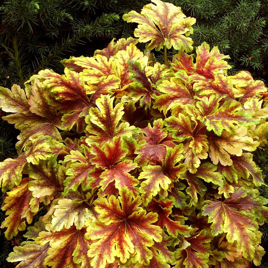 Рассада гейхереллы Голден Зебра (Golden Zebra) легко переносит перепады погоды. Невозможно отвести глаз от листьев насыщенного жёлтого цвета с пурпурной сердцевиной, что словно переносят нас в жаркие тропики. Маленькие белые цветки, как глоток свежего воздуха, также невольно притягивают взгляды. После проращивания семян гейхерелла не требует тщательного ухода за собой: достаточно лишь время от времени поливать и подкармливать удобрениями для лучшего цветения. Насекомые обычно не досаждают жизни растения, благодаря чему Гейхерелла отлично разрастается до 35-40 см в диаметре.