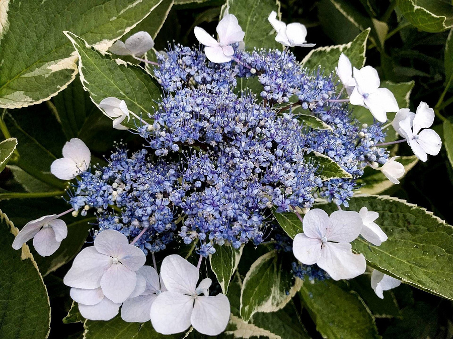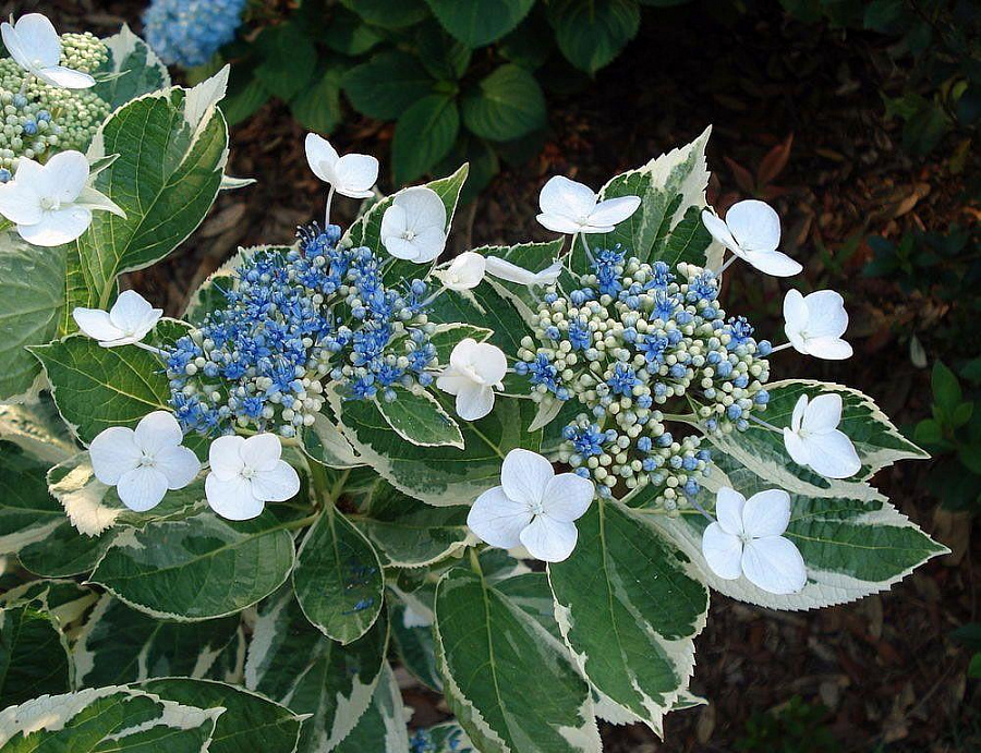 Гортензия крупнолистная Триколор (Hydrangea macrophylla “Tricolor”)-листопадный кустарник. Крона округая, куполовидная с рыхлыми и раскидистыми ветвями. Достигает 1-1,2м. в высоту и до 2 м. в диаметре. Продолжительность жизни около 25 лет. Растет быстро. Годовой прирост составляет быстро, до 15-20 см. в год.  До конечной высоты вырастает примерно за 5-10 лет. Стволы голые с серой гладкой корой, с возрастом становятся трещиноватые, серые. У ветвей сновные стебли округлые, стройные, длинные, в общей массе прямые, чуть отклоненные, побеги трубчатопустотелые, легко ломаются, ветви раскидистые, приподнятые. Побеги слабоопушенные, позже голые, серо-коричневые. Очень крепкие, которые под весом массивных соцветий не пригибаются к земле даже во время проливного дождя. В молодости светло-зеленая, по мере роста -коричневая, гладкая, старая- с красно или серо-бурой корой, позднее отслаивающейся. Листья крупные, на черешках, овальной формы, с зазубренным краем, блестящие, светло-зеленые, которые покрыты разнообразными голубоватыми, зеленовато-белыми, серыми и бледно- желтыми пятнами и полосками. Осенью становятся желтовато-зелеными, в длину могут достигать 30 см. Цветы собраны в крупные шаровидные соцветия, 15-25 см. иногда до, до 40 см. в диаметре, которые состоят из крупных стерильных цветков. Окраска цветков изменяется в процессе цветения. С появлением лайм-зелёные, позже становятся белыми, в конце цветения зелёновато-белые и долго не увядают. Цветет обильно и ежегодно на побегах текущего года, длительное, с конца июня по октябрь. Плоды: не является декоративными. Растение имеет сильно развитую мочковатую корневую систему. Светолюбива, но любит и полутень. В очень затененных – крона вытягивается, редеет и хуже цветет. К почве требовательна, лучше развивается на глубоких, рыхлых суглинках высокого плодородия, оптимальны – слабокислые. Предпочитает увлажненные, воздухопроницаемые почвы, но не переносят засоления и застойного увлажнения. Выдерживает, но слабо, карбонатные и щелочные. Предпочитает -влажные, хорошо дренированные почвы, плохо переносит застой воды и пересыхание субстрата. Страдает от засухи. В засушливые периоды желательны обильные поливы. Мало морозостойка. Зона зимостойкости: 5b (-18°С). Требует укрытия. У садовой гортензии соцветия образуются на прошлогодних побегах. Поэтому основная проблема — сохранить их целиком, чтобы цветочные почки не вымерзли и не выпрели.