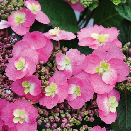 Саженцы Гортензии пильчатой Коттон Кэнди (COTTON CANDY, Hydrangea serrata) – это смесь гортензии крупнолистной и гортензии пильчатой. Невысокое малогабаритное растение, которое растет быстро, длиной 60-80 сантиметров. Гортензия имеет полушероховатые ярко-розовые с зеленоватой серединой соцветия. Цветение куста продолжается с июля по октябрь.