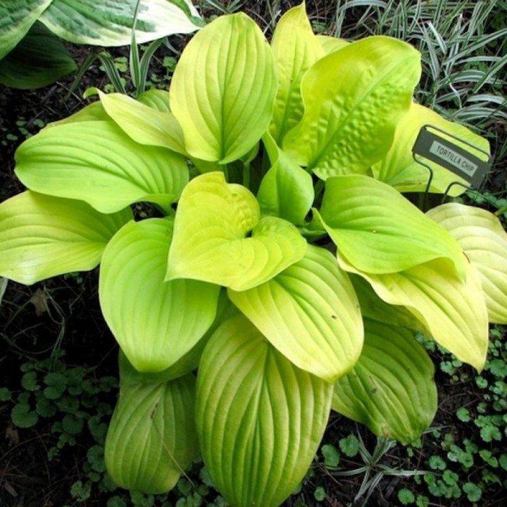 Рассада хосты Тортилла чип (Tortilla Chip) привлекает внимание необычной окраской листьев. Для сорта характерны: