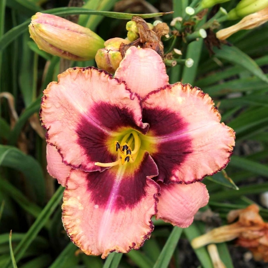 Саженцы лилейника гибридного Овесом Блоссом (Awesome Blossom) морозостойкие, не требовательные к условиям выращивания и уходу. Для выращивания подходят хорошо освещенные места с плодородной дренированной почвой, лучше с добавлением одной части песка. Этот сорт ценится за оригинальную расцветку соцветий. Его слегка гофрированные лепестки имеют нежно-розовый окрас с темно-сливовой глазной зоной такого же цвета каймой и желто- зеленым горлом. Уход за растением заключается в регулярных поливах, удалении сорняков и рыхлении поверхности земли.