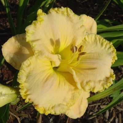 Окраска цветка : белый с жёлтым горлом и каймой, крупный,гофрированный,повторное цветение