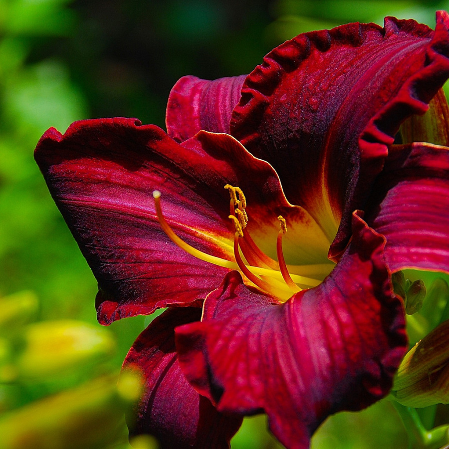 Окраска цветка : Цветок темно-пурпурный с салатово-желтым горлом