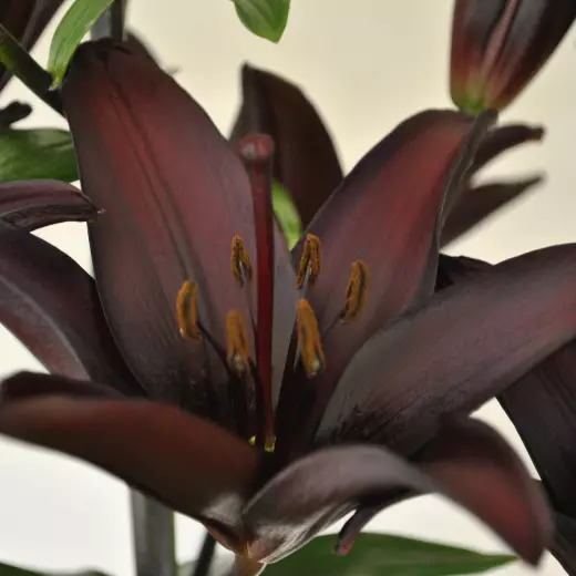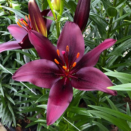 Луковицы лилии азиатской Дарк Секрет (Dark Secret) уместно разместить для контраста на клумбе с преобладанием белых цветов. Растение обладает крупными бутонами насыщенного вишнево-бордового цвета, отливающего синевой. Длинные пурпурные тычинки с оранжевыми головками только подчеркивают глубокий оттенок лепестков.
