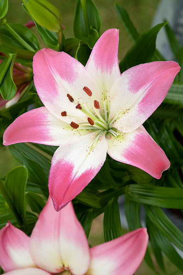 Окраска цветка : кремово-белый центр, нежно-розовые края лепестков, темно-бордовые пыльники