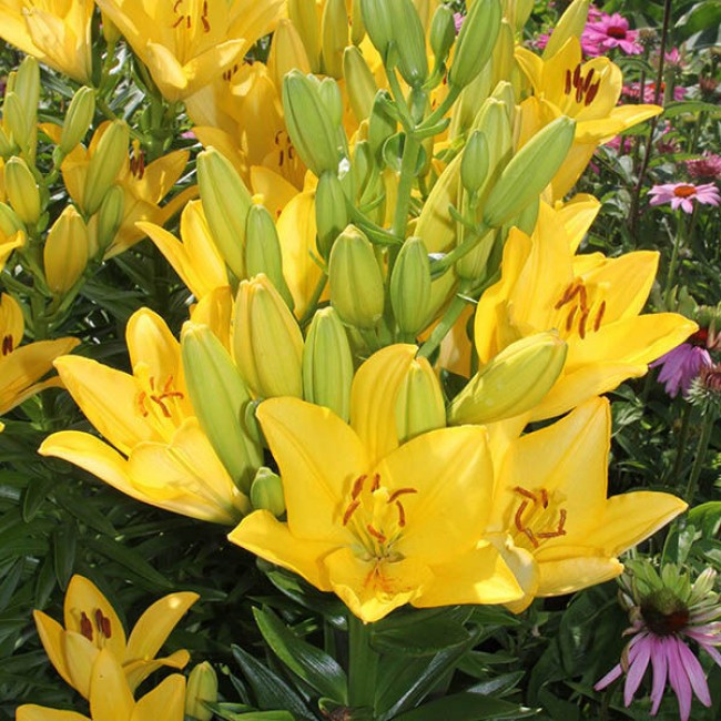 Луковицы Лилии ЛА-гибрид Голден Тайкун (Lilium LA-hybrid Golden Tycoon) воплотят в жизнь мечту цветоводов о ярких, неприхотливых, высоких цветах на садовом участке. Крупные цветы лимонно-желтого оттенка распускаются на стебле, способным вырасти выше метра в высоту. Насыщенный цвет смотрится еще более ярко, благодаря контрастным коричневым тычинкам. Изящества добавляют лилии чуть загнутые кончики лепестков с волнистыми краями. Голден Тайкун, при всей своей аристократичной привлекательности, не потребует от хозяев особого ухода и прекрасно будет  чувствовать себя как на солнечном месте, так и в полутени.