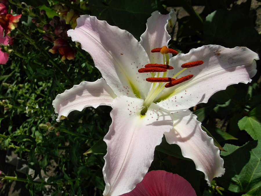 Окраска цветка : розовато-белый с редким крапом и оранжевыми тычинками, гофре по краю