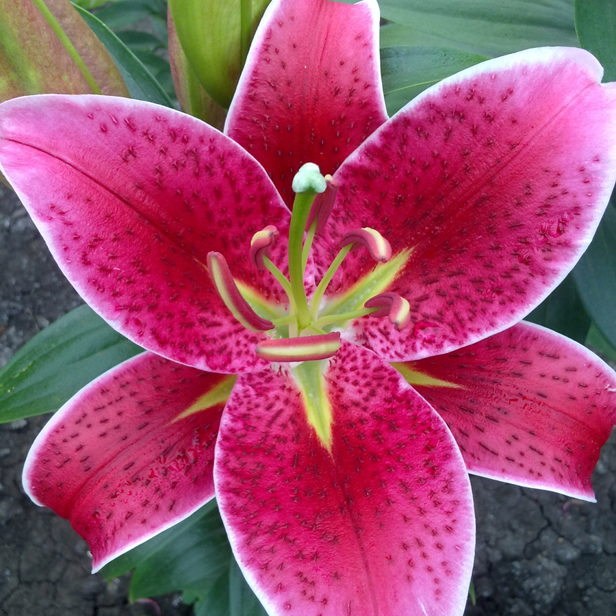 Окраска цветка : малиново-красный ,с тёмным крапом, зелёное горло, край белый