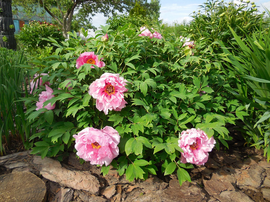 Саженцы пиона древовидного Розовая пудра (Paeonia Suffruticosa) отличаются необычными, похожими на цветки лотоса соцветиями. Кусты раскидистые, высокорослые, высота стеблей достигает 1,2 метров. Зелень эффектно смотрится даже после того, как бутоны отцветают. Лучше всего пионы смотрятся в одиночных посадках. Высаживать рекомендуется на солнечных участках. Лепестки нежного розового оттенка по краям практически белые, а в середине – с бордовыми вкраплениями. У сорта крупная сердцевина с большим количеством желтых тычинок. Соцветия крупные, диаметром до 15 сантиметров.