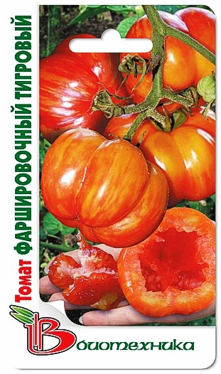 Семена томата "Фаршировочный тигровый " (Farshirovochnyj tigrovyj) высевают на рассаду в конце марта – начале апреля. Высадку в открытый грунт проводят, когда минует угроза заморозков. Сорт среднеспелый. В плодоношение вступает на 110-120 день от всходов и имеет неограниченную высоту растения при выращивании в защищенном грунте. На простой кисти появляется 5-7 одинаковых плодов кубовидной формы с четко выраженными долями. Красные помидорки с желто-оранжевыми полосами имеют массу 120-130 грамм и созревают практически одновременно. Отличаются пустотелой структурой с легко отделяемой семенной камерой и толстыми стенкам.