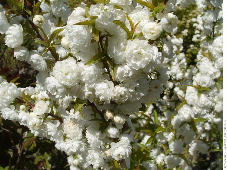 Саженцы вишни Железистой Альба Плена (Alba Plena) не оставят никого равнодушным в период цветения, не зря ее называют Русская Сакура. Характерная для культуры многочисленность цветков усиливается махровостью бутонов, благодаря чему белая крона кажется больше размером. Цветение начинается в мае и длится более 3 недель, позволяя в полной мере насладиться пышным шиком и девственной белизной. Вишня растет в виде раскидистого кустарника высотой до 2 метров. После цветения растение не теряет привлекательности за счет густой светло-зеленой кроны.