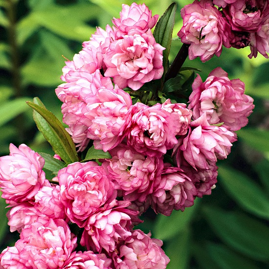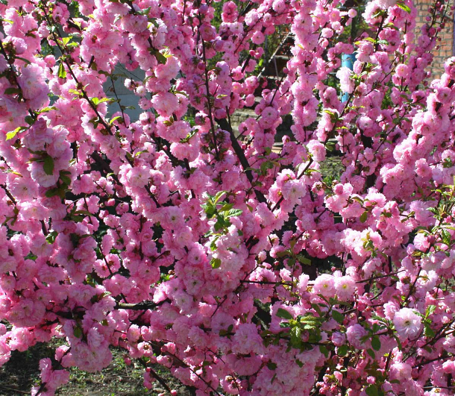 Саженцы вишни Железистой Розеа Плена (Rosea Plena) считаются одними из самых красивых представителей этого рода растений. В мае, еще до появления листочков на ветвях, побеги густо покрываются очень крупными махровыми цветками бело-розового цвета с сиреневым отливом. Раскрытый бутон достигает 2,5 сантиметров в диаметре, он похож на миниатюрный лотос или анемон своей формой. Цветов на ветке очень много, они буквально облепляют побеги, превращая растение в пышное розовое облако. Цветение длится 3 недели, начинаясь в мае.